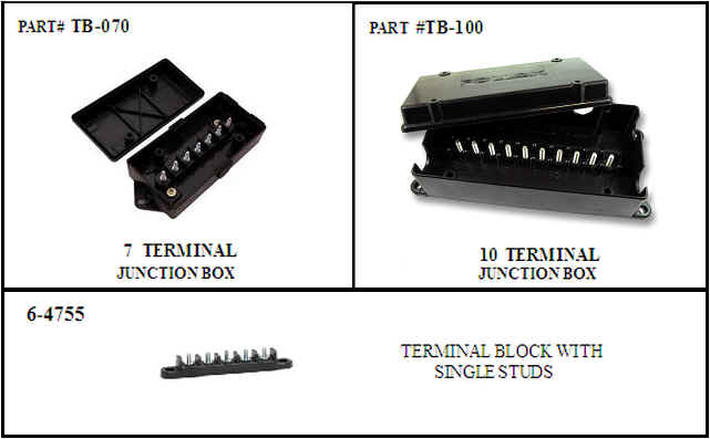 Del Mar Wire & Products caries Cole Hersee 4-Pole to 10 Pole Terminal Junction Blocks with Independent Hot feed connections and double screwTerminals. The TB-070 & TB-100 comes in a sealed box.